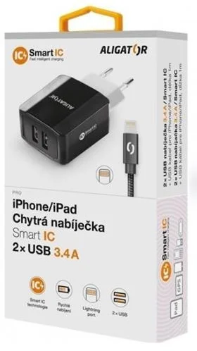 Chytrá síťová nabíječka ALIGATOR 3.4A, 2xUSB, smart IC, černá, kabel pro iPhone/iPad 2A