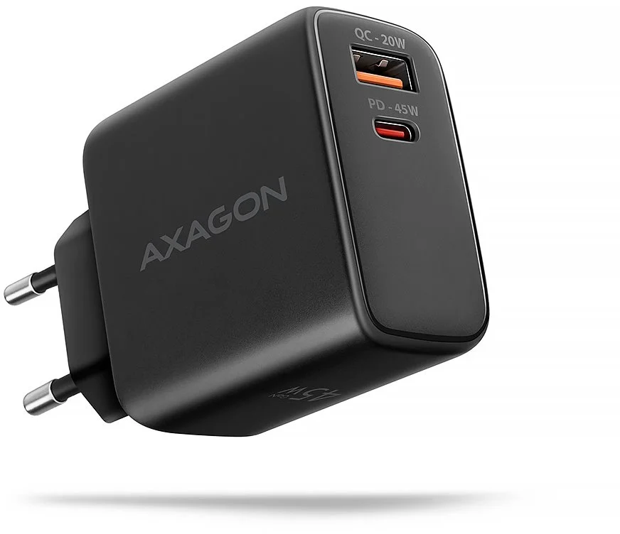 - AXAGON ACU-PQ45 GaN nabíječka do sítě 45W, 2x port (USB-A + USB-C), PD3.0/PPS/QC4+/SFC 2.0/AFC/Apple
