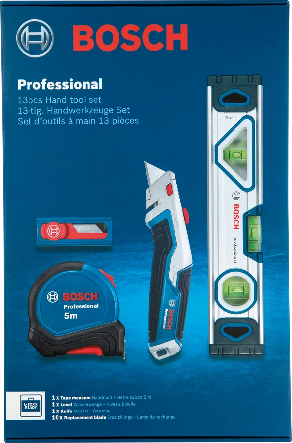 Všestranná 13dílná sada ručního nářadí nabízí množství nástrojů, které jsou často potřebné pro nejrůznější každodenní práce na stavbě. Robustní konstrukce sady a použití nejkvalitnějších materiálů podporují její dlouhou životnost. Sada je dodávána v praktickém balení - poloviční vložce kompatibilní s mobilním systémem Bosch L-BOXX. Obal zajišťuje, že veškeré nářadí sady je úhledně a bezpečně uloženo.