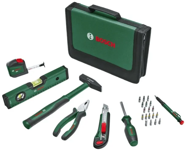 Univerzální 25dílná sada ručního nářadí Bosch obsahuje všechno správné vybavení na rozmanité kutilské opravy, údržbu a dekorativní práce doma či na cestách. Sada se skládá z kombinovaných kleští, univerzálního šroubováku, 300g kladiva ze sklolaminátu, odlamovacího nože, 3metrového měřicího pásma, kapesní 25cm vodováhy, značkovače do hlubokých otvorů a 18 bitů různých velikostí. Toto nářadí je vyrobeno z vysoce kvalitních materiálů, je robustní a dlouho vydrží. Pro optimální pohodlí nabízí ergonomické prvky, jako jsou pogumované plochy či tvarování.