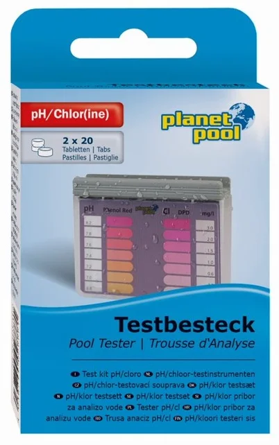 Pomocí této testovací sady rychle a snadno určíte hodnotu pH a koncentrace volného chlóru v bazénové vodě. Použijte tablety Phenol Red ke stanovení hodnoty pH a tablety DPD1 ke stanovení hodnoty koncentrace volného chlóru.