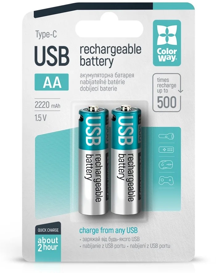 - ColorWay nabíjecí baterie AA 2200mAh/ USB-C/ 1.5V/ 2ks v balení
