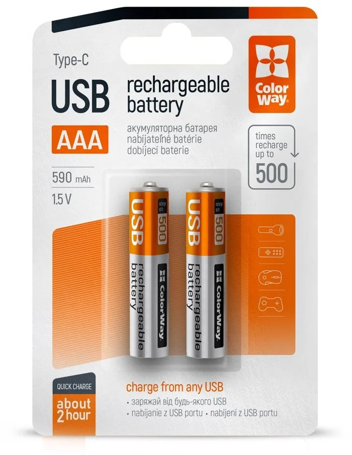 - ColorWay nabíjecí baterie AAA 590mAh/ USB-C/ 1.5V/ 2ks v balení