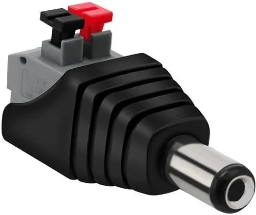 DC napájecí konektor typu male s rozměry 2.1 x 5.5 mm slouží k napájení zařízení, jako jsou LED pásky, adaptéry, měniče napětí, apod., která jsou opatřena shodnou DC zásuvkou. Díky svorkovnici odpadá nutnost pájení a zařízení lze jednoduše připojit. Vodič se ke konektoru připojuje pomocí pružinové svorkovnice a není třeba žádný šroubovák.