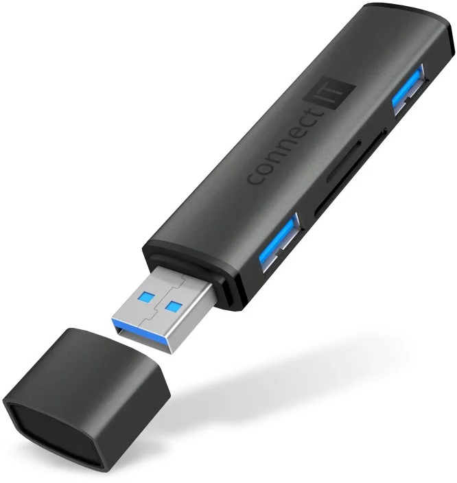 - CONNECT IT COMPACT 4v1 USB-A hub + čtečka karet, (2xUSB-A 3.0, 1xSD, 1xMicroSD), externí, ANTRACITOVÁ