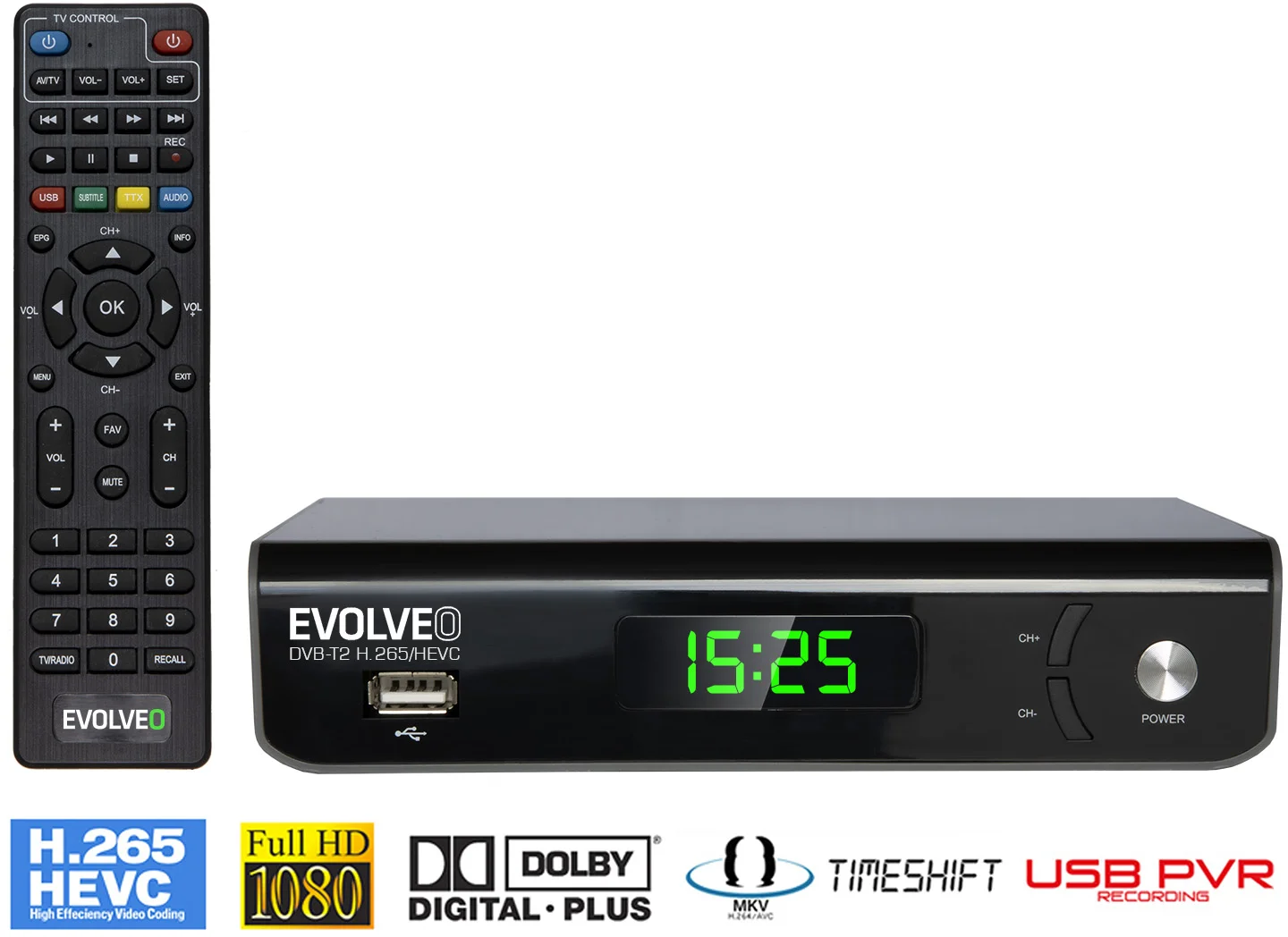 EVOLVEO Omega S3 je multimediální HD DVB-T2 H.265/HEVC rekordér, který zvládne nahrávání vašich oblíbených pořadů a navíc vám umožní přehrávat videa z USB flash disku nebo externího pevného disku.