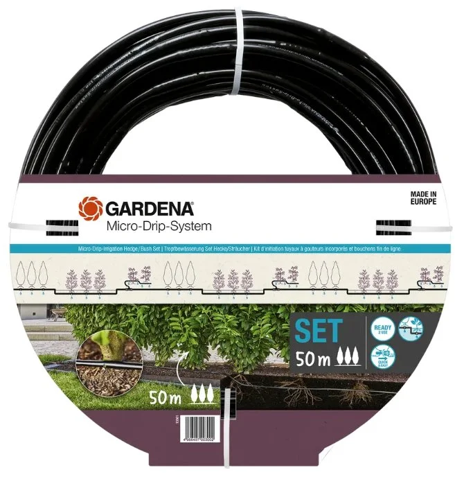 GARDENA Micro-Drip sada na zavlažování živých plotů/keřů (50 m) zajišťuje spolehlivé a vodu úsporné zavlažování vašich živých plotů, keřů, křovin nebo rostlin na předzahrádce.