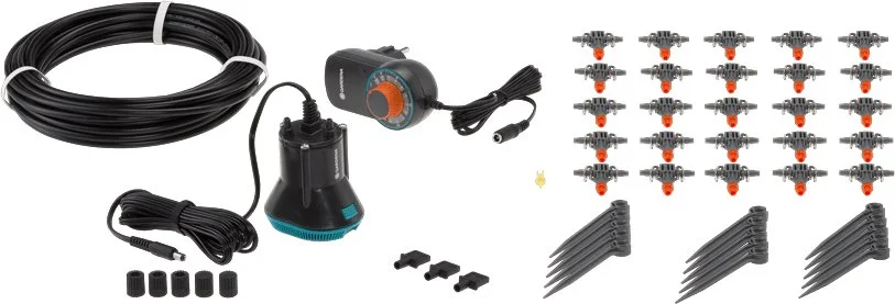 Automatické zavlažování květinových truhlíků od společnosti GARDENA automaticky zavlažuje až šest metrů truhlíků na květiny. S vestavěným časovačem s 13 pevnými programy lze vaše truhlíky na květiny snadno zavlažovat i ve vaší nepřítomnosti. Pro nezávislost na vodovodním kohoutku lze zavlažování truhlíků na květiny provádět například přímo z nádrže na dešťovou vodu. Pokud má být spojeno více než šest metrů truhlíků na květiny, lze sadu prodloužit. V sadě je transformátor s otočným spínačem pro výběr zavlažovacího programu, nízkonapěťové čerpadlo 14 V s filtrem na nečistoty, 25 řadových kapačů (2 l/h) s koncovou krytkou a čisticí jehlou, 10 m přívodní potrubí 4,6 mm (3/16") a 15 držáků na trubky.