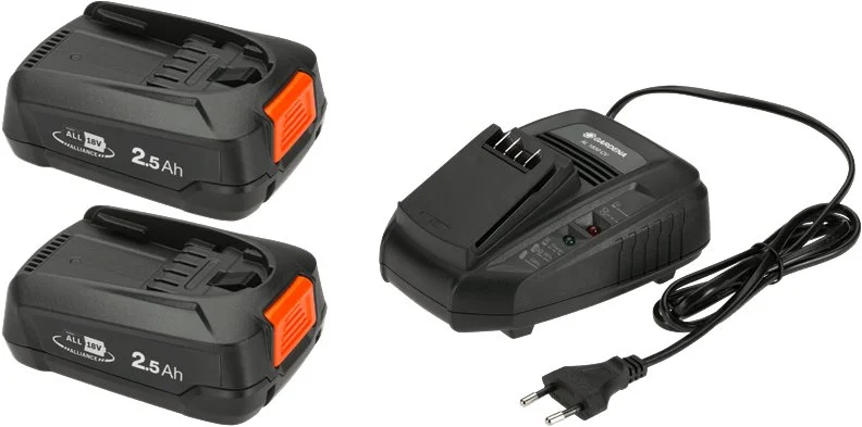 Tato startovací sada se skládá z rychlonabíječky GARDENA AL 1830 CV a dvou akumulátorů 2,5 Ah POWER FOR ALL.Každý akumulátor se úplně nabije do 60 minut. LED indikátor na nabíječce ukazuje stav nabití. Pokud budete potřebovat, aby vaše zařízení bylo připraveno k akci co nejdříve: nabijte jej na 80 %, dokud se nerozsvítí LED „Ready to go (Připraven k použití)“. U akumulátoru 2,5 Ah trvá nabíjení až na 80 % pouze 40 minut.Tato startovací sada se perfektně hodí pro sekačky na trávu nebo ruční zahradní nářadí. Použitím dvou akumulátorů po sobě prodloužíte dobu provozu na maximum. Tato startovací sada je výrobkem Aliance POWER FOR ALL, jedné z největších aliancí předních výrobců akumulátorů různých značek. Tuto sadu lze použít ve všech výrobcích 18V řady POWER FOR ALL. Znamená to, že po zakoupení této startovací sady můžete nabíječkou a akumulátor používat pro všechny vaše produkty. Ušetříte peníze a získáte trvalou flexibilitu! Vášeň poháněná značkou GARDENA - zahradní akumulátorové vybavení, které vám poskytuje svobodu při práci.