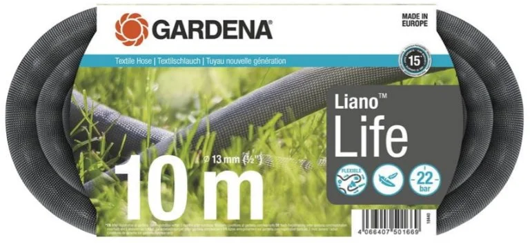 Textilní hadice Liano™ Life 10 m značky GARDENA je všestranná pro krátkodobé a střednědobé zavlažování v malých zahradách nebo na balkonech. Hadice o průměru 13 mm (1/2") je rychle připravena k použití díky předmontovaným dílům Original GARDENA systému: rychlospojce Liano™ a stopspojce Liano™ a v neposlední řadě také díky pružné textilní tkanině. Flexibilní vnitřní hadice z PVC poskytuje spolehlivý výkon a inovativní vnější hadice z odolné textilie zvyšuje její trvanlivost. Hadice Liano™ Life se vyznačuje mimořádnou flexibilitou, která vám pomůže například při zavlažování zahrady nebo při úklidu. Snadno s ní manévrujete po zemi, protože je elastická, a tím je méně pravděpodobné, že se zachytí o překážky nebo se zalomí. Je až o 50 % lehčí než běžné PVC hadice, takže ji můžete pohodlně držet v ruce i po dlouhou dobu. Navíc je příjemná na omak. Díky své dobré flexibilitě se hadice snadno přizpůsobí vašemu stávajícímu úložnému prostoru, takže ji můžete snadno a kompaktně uložit. Tlak, při kterém dojde k prasknutí hadice Liano™ Life, činí 22 barů. Tato hadice je odolná vůči UV záření a mrazu, můžete ji skladovat venku po celý rok. Liano™ Life neobsahuje škodlivé látky, tedy ani ftaláty (<0,1 %), kadmium, olovo a baryum (<0,1 %). Kvalitní výrobek textilní hadice Liano™ Life je vyrobena v Evropě a je podpořena 15letou zárukou výrobce GARDENA po registraci na adrese gardena.com/registration do 3 měsíců od zakoupení. Stvořeno pro extrém. Navrženo pro každý den. Textilní hadice Liano™.