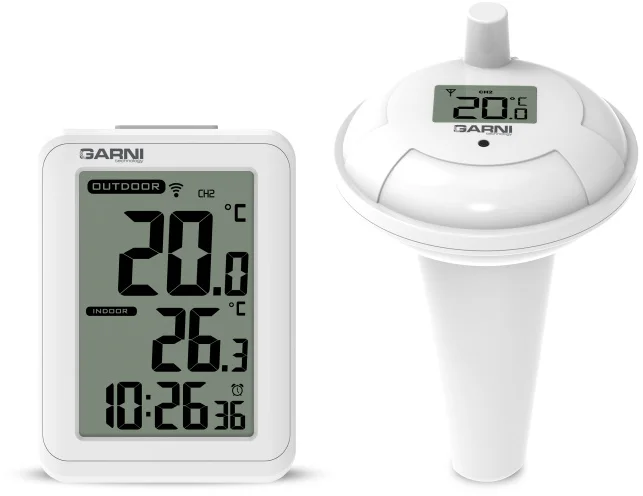 Digitální teploměr s bazénovým čidlem GARNI 245P pro měření teploty vody zobrazuje také teplotu na místě hlavní jednotky a čas. Bezdrátové bazénové čidlo GARNI 065P je kompatibilní s meteorologickými stanicemi GARNI 612 Precise, GARNI 615W Precise, GARNI 615B Precise, GARNI 618W Precise a GARNI 618B Precise.