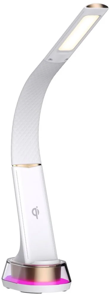 Praktická stolní lampička s pokročilou LED technologií, ohebným ramenem a moderním designem. Bílá imitace kůže v kombinaci se zlatými prvky z ní dělá stylový vizuální doplněk, vhodný například pro studentský pokoj či domácí kancelář. Nastavení intenzity osvětlení i barevné teploty probíhá pomocí dotykového tlačítka. Noční RGB podsvícení se 3 volitelnými světelnými módy pomáhá vytvořit příjemný světelný podtón v místnosti a zároveň skvěle doplňuje celkový vzhled lampičky. Dále je k dispozici bezdrátová nabíječka standardu Qi s výkonem 10 W a nabíjecí USB port. Mobilní telefon s podporou bezdrátového nabíjení se začne nabíjet při pouhém položení na nabíjecí plochu.
