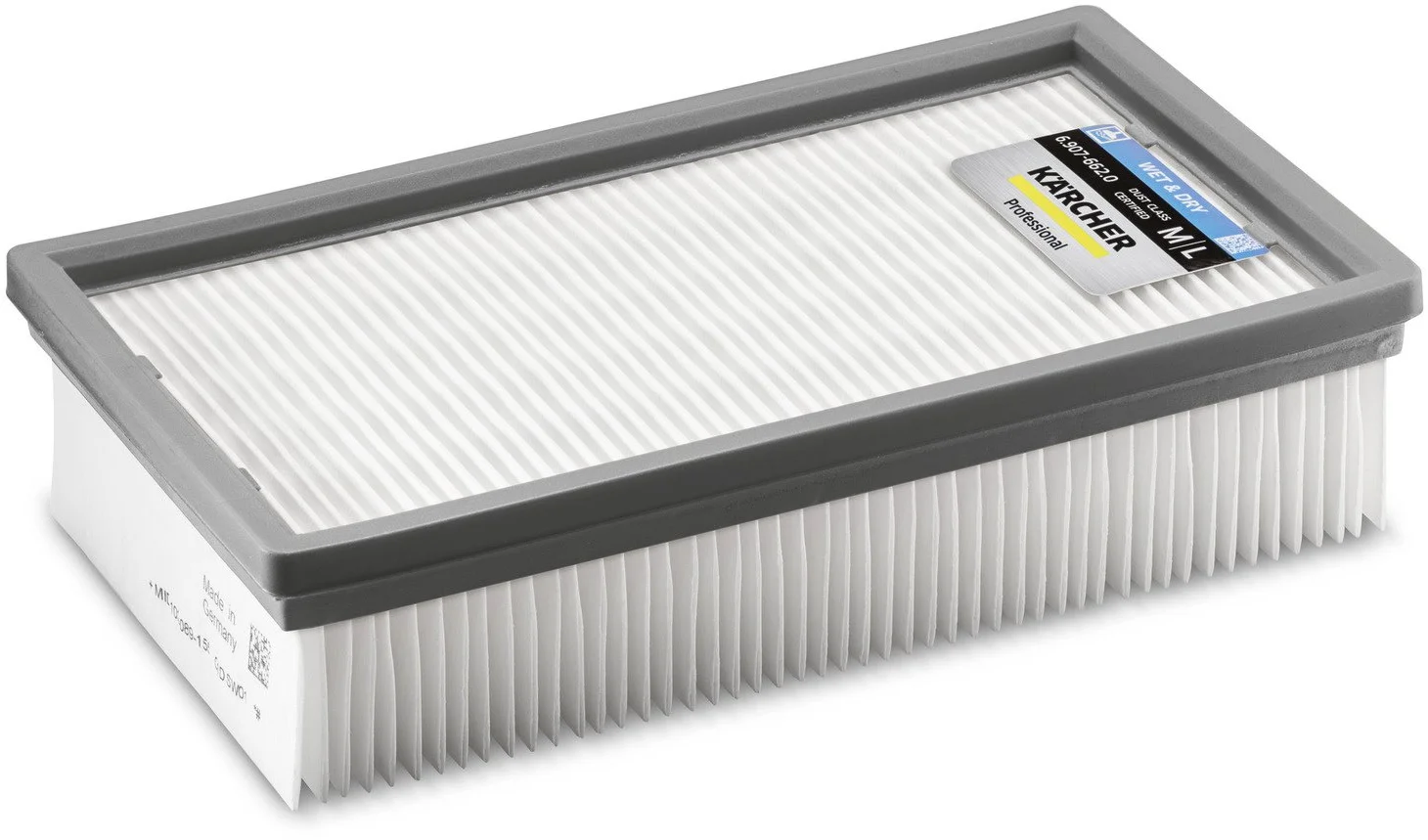 Univerzální plochý skládaný filtr Wet & Dry se stupněm odlučování prachu 99,9%, certifikovaný pro třídy prachu M a L a kompatibilní se všemi modely motorů NT Tact a Ap od společnosti Kärcher.