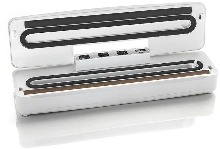 Uzamykací systém zaručí nerušený proces. K dispozici jsou 2 možnosti utěsnění, standard pro suché potraviny a strong pro vlhké suroviny. V sadě je hadička pro vakuování v dózách a 1 ks role.