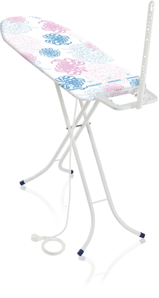 žehlicí plocha M : 120 x 38 cm, plynule nastavitelná výška od 76cm až do 87 cm, pevná odkládací plocha pro žehličku s vodící anténou na kabel a německou elektrickou zásuvkou s prodlužovačkou, ideální pro začátečníky nebo malé až střední domácnosti, záruka 3 roky