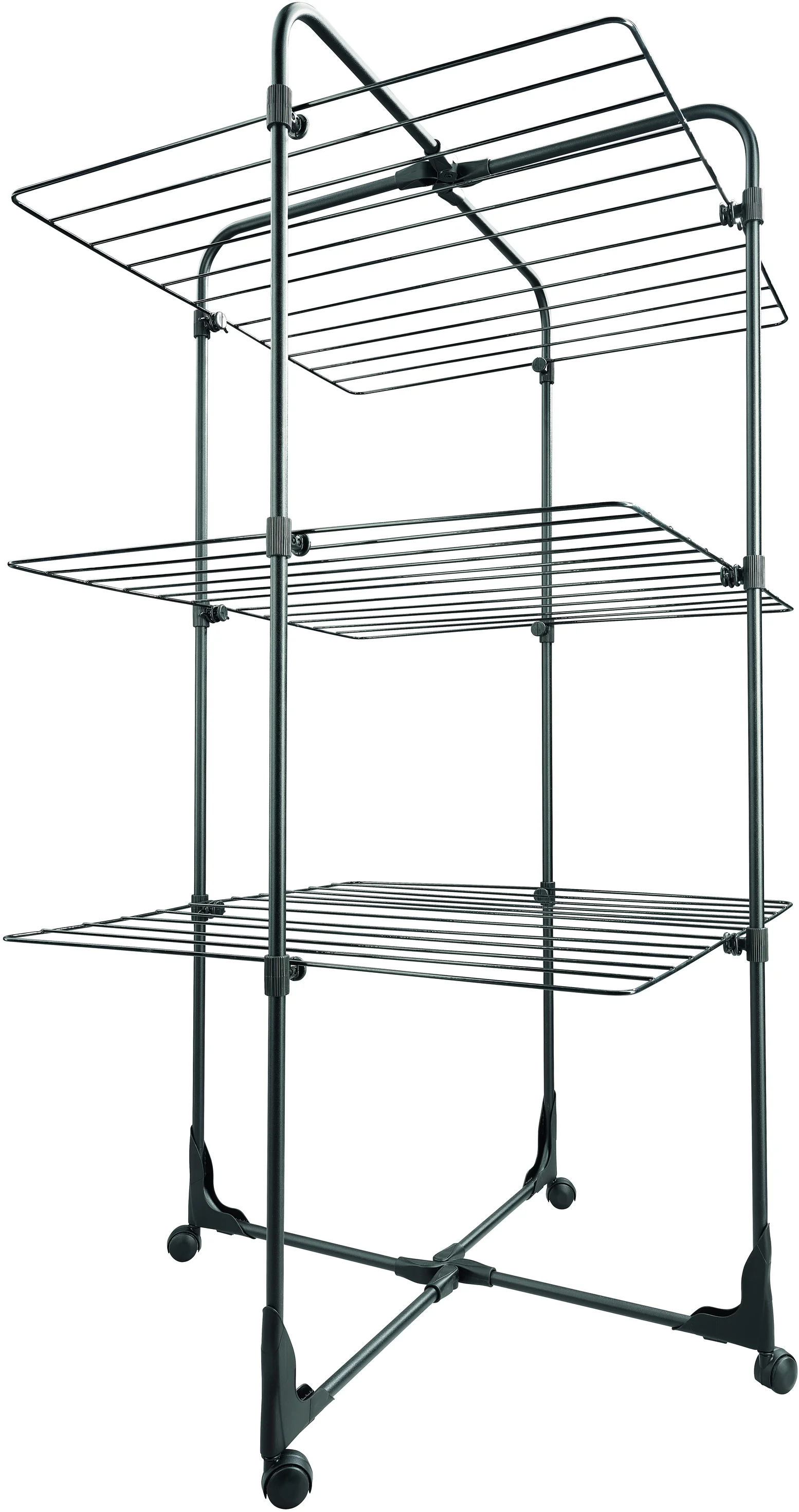 praktický patrový sušák na prádlo, možnost umístění do sprchového koutu, 3 patra nad sebou pro úsporu místa, všechna patra jsou sklopná, možnost zavěšení dlouhých kusů oděvů, 4 integrovaná kolečka, mobilní do všech směrů (360°), 27 m sušící plochy = až 3 pračky prádla, nyní nově v designové černé barvě, záruka 3 roky;