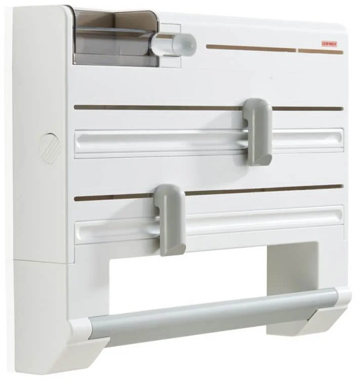 Praktický pomocník pro uspořádání kuchyňských fólií a utěrek vybavený navíc integrovaným dávkovačem na samolepicí pásku, s extra prostorem na malé drobnosti a extra prostorem na sáčky do mrazáku.
