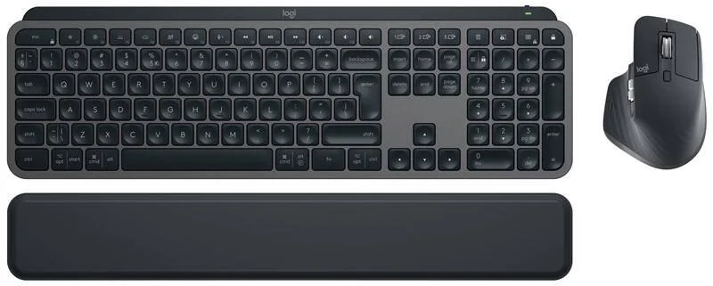 Klávesnice MX Keys S, opěrka Palm Rest a myš MX Master 3S na stole