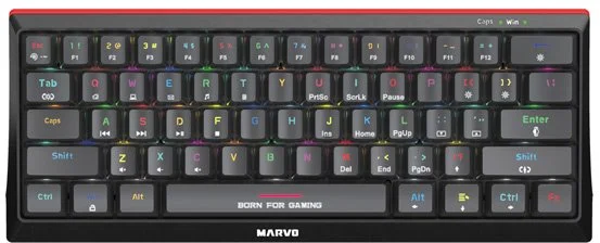 I společnost Marvo jde s dobou, a proto přinesla tuto zmenšenou krásku. Tato herní klávesnice má 60% TKL design bez numerické části. Ptáte se proč? Jak gaming, tak i požadavky hráčů jsou náročnější každým dnem, někomu nevyhovuje velikost klávesnice, někdo nepotřebuje numerickou část. Tento model uspokojí jak náročné hráče, tak i přiležitostné gamery. Svou kompaktní velikostí potěší všechny ty, kteří rádi hrají u svých kamarádů a nebo klávesnici používají na více zařízeních. Absenci numerické části nahrazuje tlačítko FN, které při správné kombinaci nahradí všechny chybějící klávesy.