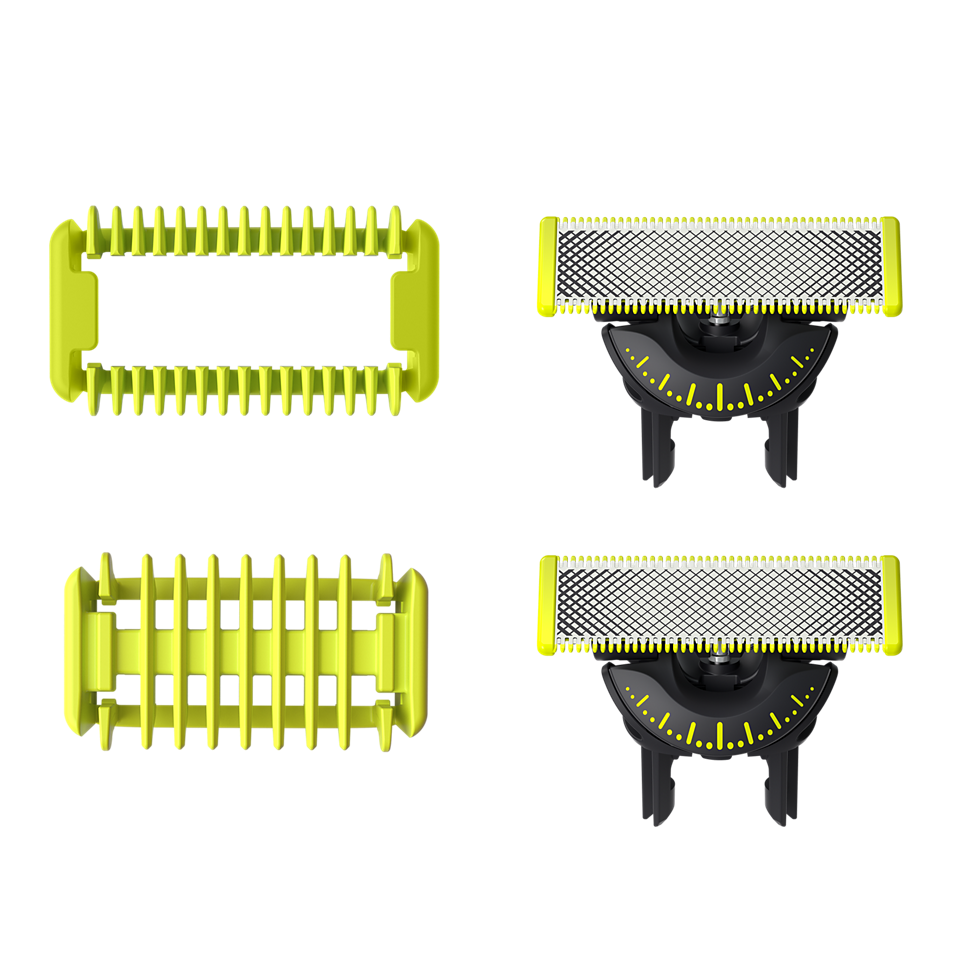 Náhradní břity na tvář a tělo pro Philips OneBlade 360, v balení 2ks břitu 360, 1 ochranný nástavec proti pořezání v citlivých oblastech + 1 hřeben na tělo (3 mm).