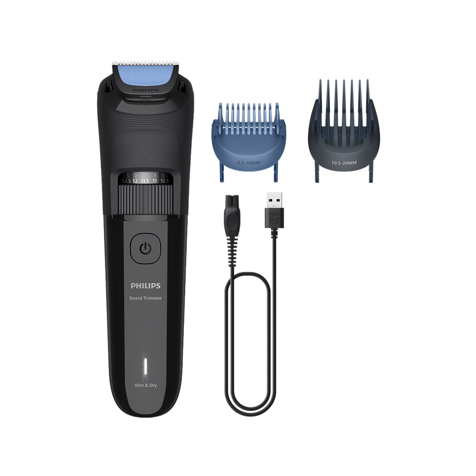 Příslušenství: čisticí kartáček, 2 nastavitelné hřebeny na vousy (0,5-10mm; 10,5-20 mm), kabel USB (adaptér není součástí balení).
