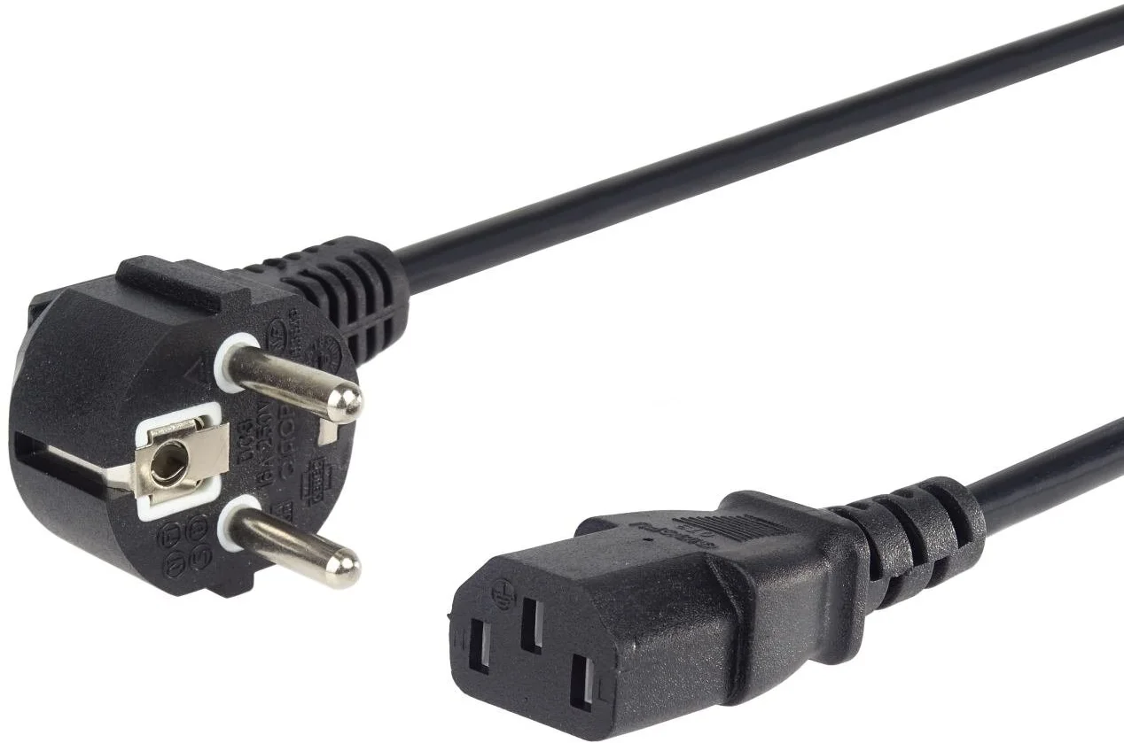 Napájecí kabel v černém provedení pro počítač nebo monitor. Třížilový kabel je zakončený standardní přístrojovou zástrčkou.