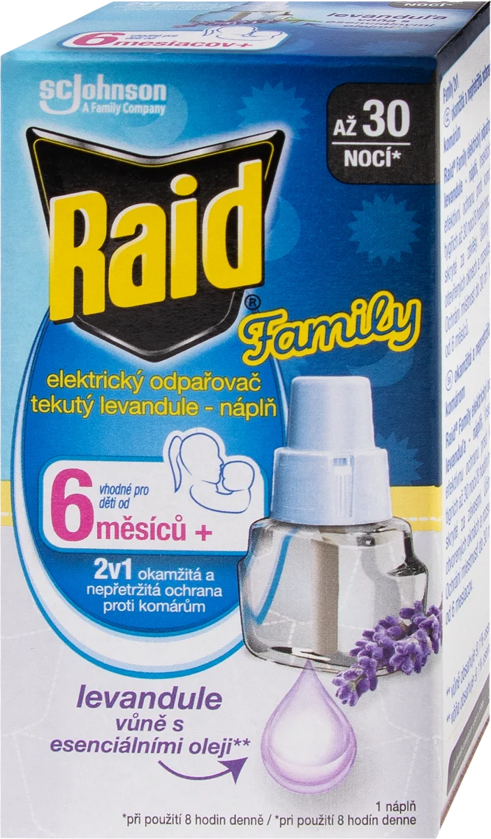 Raid Family náhradní náplň je vhodná do elektrického odpařovače. Poskytuje efektivní ochranu proti komárům a ostatnímu drobnému létajícímu hmyzu až 30 nocí, při použití 8 hodin/noc i při mírně otevřených oknech a rozsvícených světlech. Navíc je s obrázky hvězdiček a měsíčků. Tento přípravek je speciálně vyrobený pro děti od 6 měsíců. Family náhradní náplň pro elektrický odpařovač od značky Raid je s vůní obsahující levandulový esenciální olej a neobsahuje parfemaci.