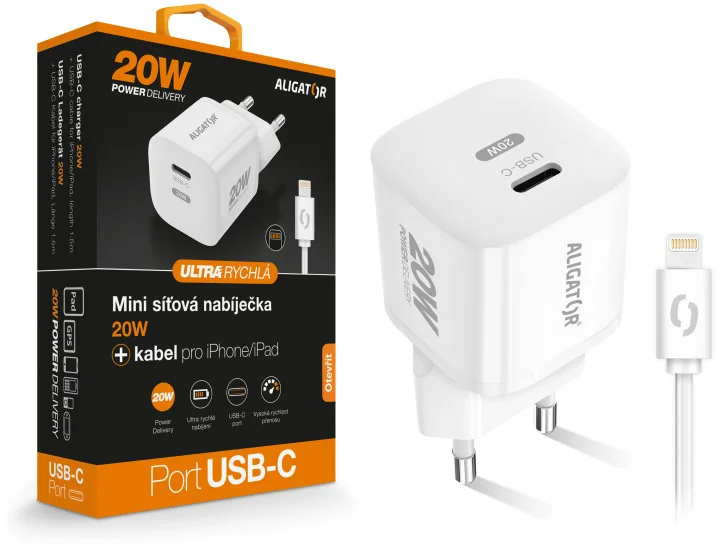 - Rychlá nabíječka ALIGATOR Mini, PD 20W, USB-C/Lightning kabel, bílá