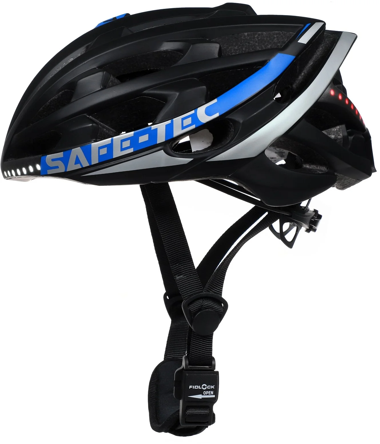Mezi důležitou výbavu helem Safe-Tec patří LED pásky na přední (bílé světlo) i zadní straně (červené světlo). Moderní LED plní funkci nejen bezpečnostního osvětlení cyklisty (možnost svícení a blikání), ale lze je také využít jako dynamická směrová světla v případě odbočování (oranžové světlo vpředu i vzadu). Ovládání světel se provádí jednoduše pomocí bezdrátového dálkového ovladače, který se snadno upevnění na řídítka díky dodanému držáku. Další bezpečností vychytávkou je funkce pro prudké zabrzdění, kdy jakmile k němu dojde, zadní LED začnou automaticky červeně blikat a upozorní tak jezdce za vámi na možné nebezpečí.