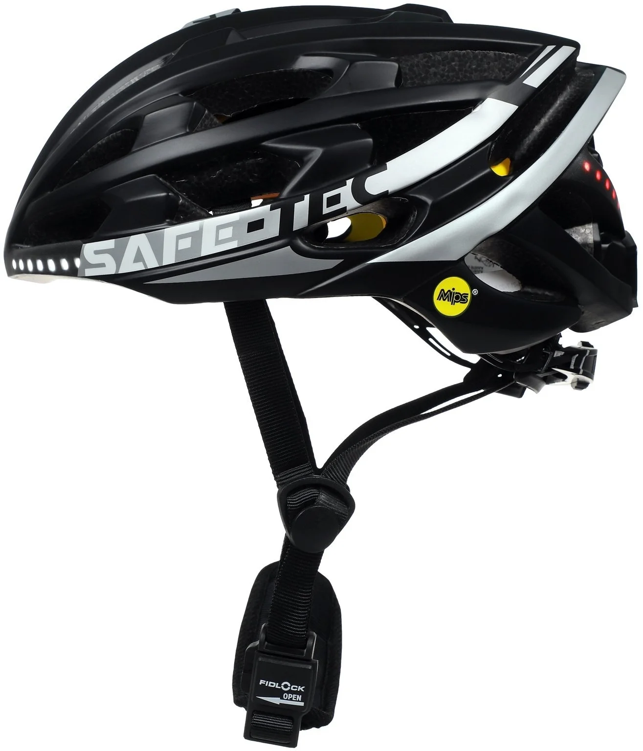 Mezi důležitou výbavu helem Safe-Tec patří LED pásky na přední (bílé světlo) i zadní straně (červené světlo). Moderní LED plní funkci nejen bezpečnostního osvětlení cyklisty (možnost svícení a blikání), ale lze je také využít jako dynamická směrová světla v případě odbočování (oranžové světlo vpředu i vzadu). Ovládání světel se provádí jednoduše pomocí bezdrátového dálkového ovladače, který se snadno upevnění na řídítka díky dodanému držáku. Další bezpečností vychytávkou je funkce pro prudké zabrzdění, kdy jakmile k němu dojde, zadní LED začnou automaticky červeně blikat a upozorní tak jezdce za vámi na možné nebezpečí.