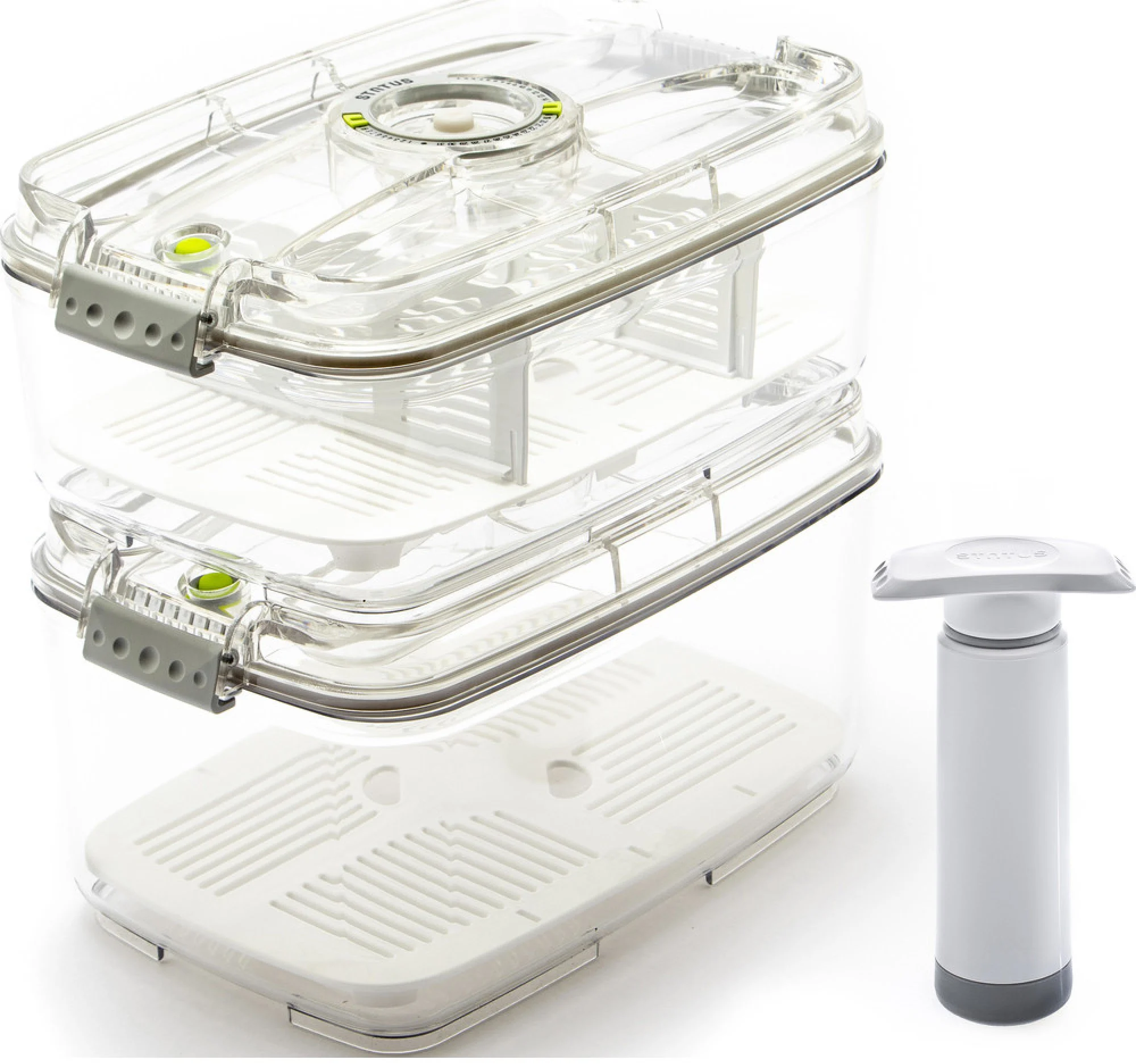 Vakuovací set, vakuový box 3 l / 4,5 l, 2 ks odkapávacích dílů a předělů, ruční vakuová pumpa, vhodné do mikrovlnky, ledničky, mrazicího boxu, myčky.