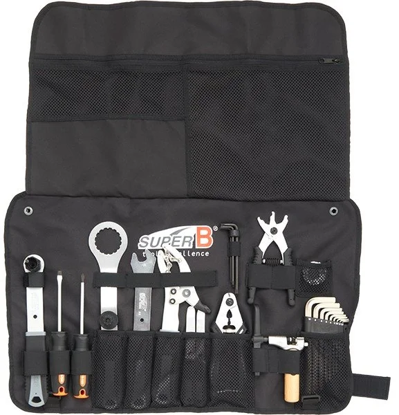 klíč na kazety, plochý šroubovák, křížový šroubovák, klíč na středové složení BSA SH.Hollowtech II, klíč na vymezení axiální vůle klik, klíč 15mm na pedály, kleště na demontáž kazety, 2x ocelové profi montpáky, profi kleště na bovdeny a lanka, universální nýtovač 5-12 rychlostí, sada imbusů 1,5;2;2,5;3;4;5;6;8;10mm, kleště na rychlospojky, centrovací klíč, sada torx klíčů T15/T20/T25/T30, rolovací obal