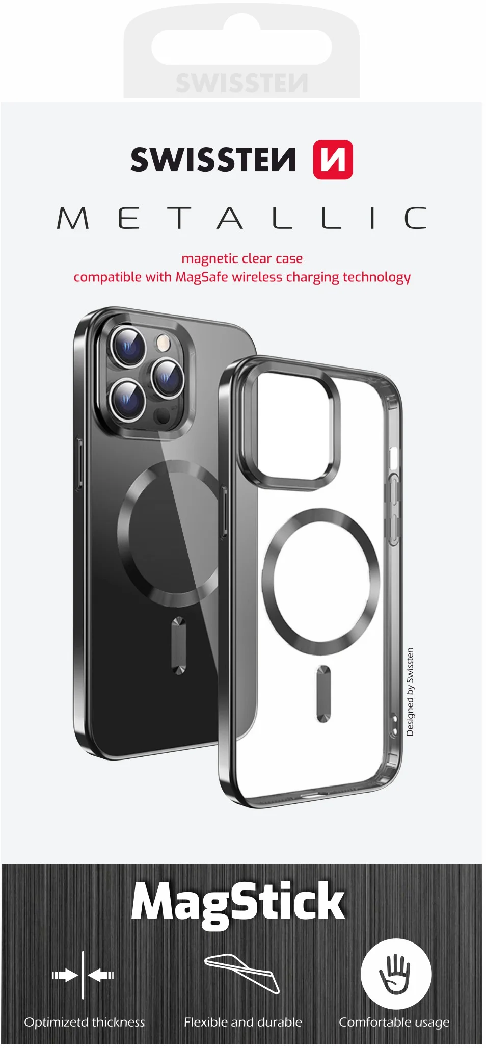 Luxusní čiré pouzdro SWISSTEN MagStick Metallic s elegantním černým rámečkem a metalickými doplňky. Vhodné pro dobíjení MagSafe. Baleno v blistru SWISSTEN