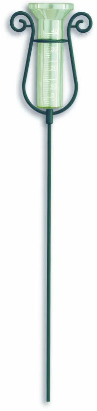 Plastová nádoba na měření dešťových srážek včetně kovového stojanu, v zelené barvě.