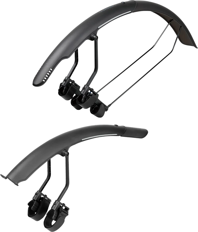 Zadní dvoubarevný blatník s rychlou, bezpečnou a jednoduchou montáží. Nastavitelné vzpěry zajišťují těsnější přilnutí k pneumatice a vynikající ochranu před blátem, zatímco vysoce leštěná spodní strana pomáhá předcházet usazování nečistot a usnadňuje čištění. Přiložené reflexní nálepky 3M zajišťují bezpečnost v noci.