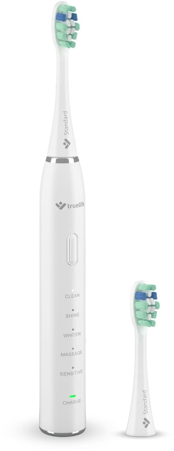 Krásný úsměv začíná správnou každodenní péčí o zuby. Skvělým cenově dostupným a výkonným pomocníkem je sonický kartáček TrueLife SonicBrush Clean30 se sonickou technologií SonicTrue®. Jeho 70 000 pohybů za minutu zuby dokonale vyčistí a jde i dál díky možnosti výběru z 5 režimů čištění. Clean vyčistí zuby a odstraní zubní plak, Shine zbaví zuby skvrn od čaje a kávy, k vybělení slouží režim Whiten, dásním udělá dobře Massage a pro citlivé zuby a dásně je určen režim Sensitive. Balení obsahuje 2 hlavice Standard, jejichž modré štětinky zhruba po třech měsících zbělají. Tím indikují, že je potřeba hlavici vyměnit. Na jedno nabití vydrží kartáček 30 dní, pak ho jen stačí dobít pomocí přiloženého USB-C kabelu.