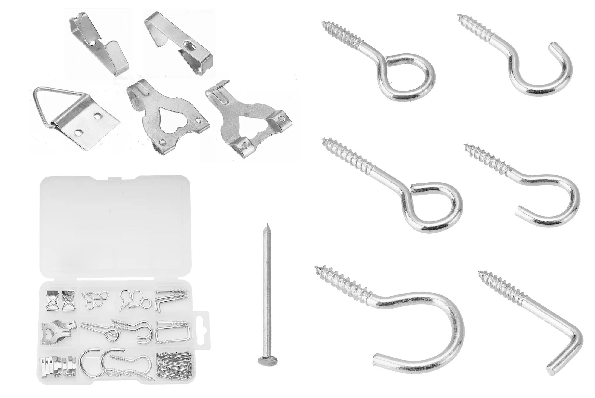 Sada 140 ks šroubovacích háků, ramínek na obrazy, šroubovacích ok, běžných hřebíků a dalších upevňovacích prvků, vyrobených z uhlíkové oceli s galvanickým zinkováním pro ochranu proti korozi. Vhodné pro zavěšení obrazů, upevnění různých předmětů a další montážní práce.