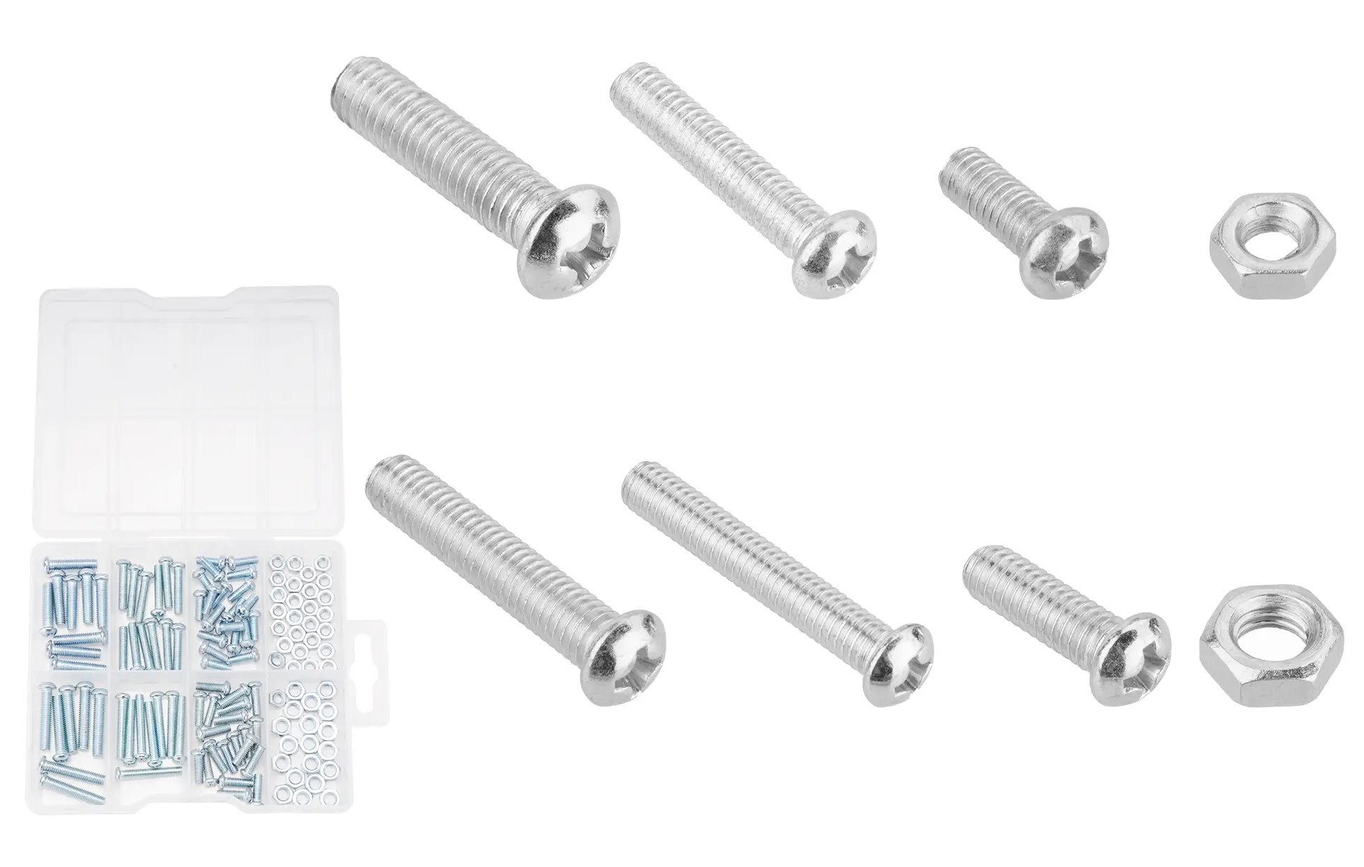 Kompletní sada 164 ks závitových šroubů a matic z uhlíkové oceli s pozinkovanou povrchovou úpravou nabízí široké využití při montážích a opravách. Šrouby s kulatou hlavou jsou vybaveny phillipsovým pohonem pro snadnou a pevnou instalaci. Sada obsahuje různé velikosti šroubů a odpovídajících šestihranných matic, které jsou také z uhlíkové oceli s pozinkovanou úpravou, pro maximální pevnost a odolnost.