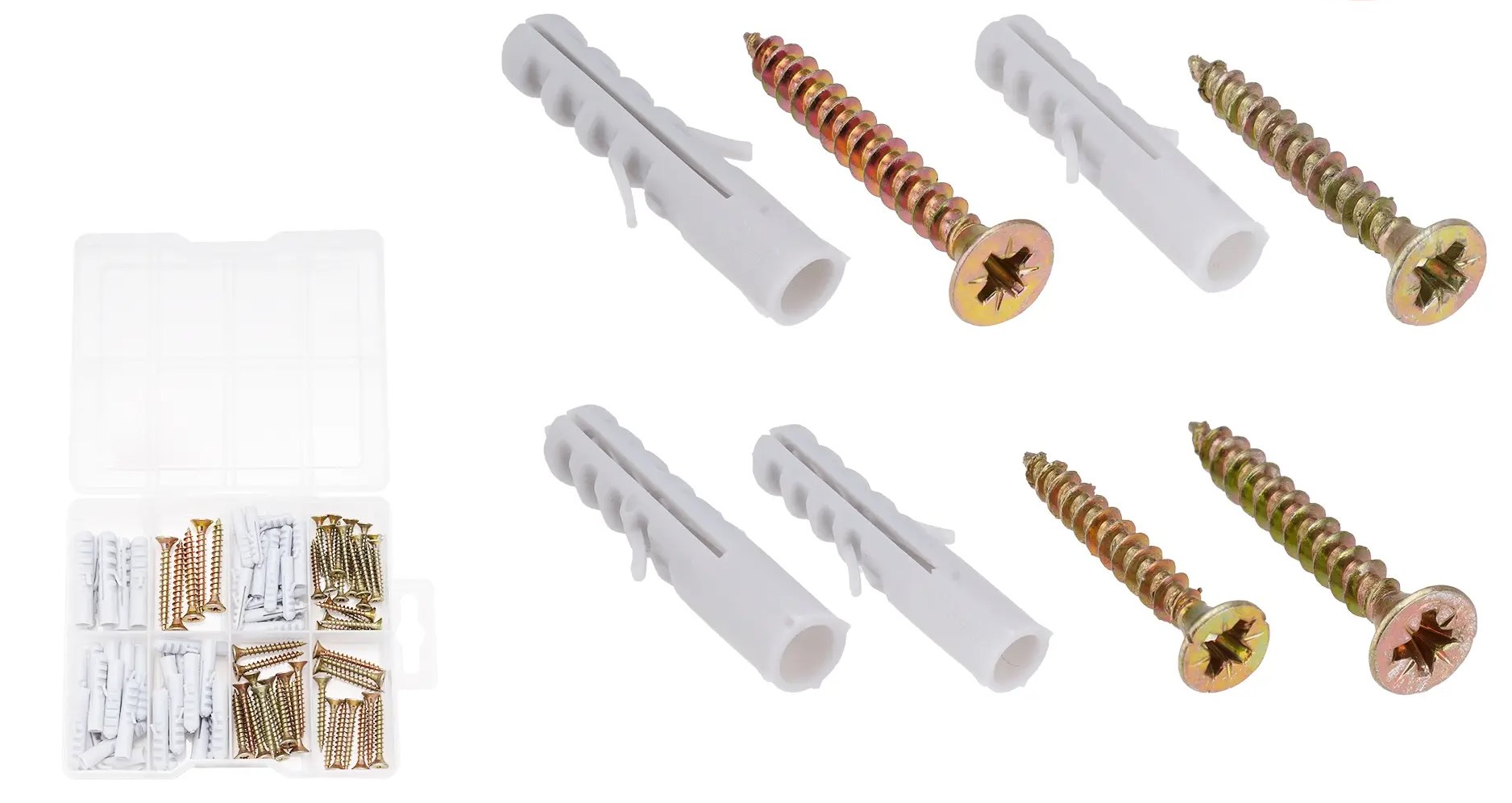 Sada obsahuje šrouby určené pro dřevotřísku, vyrobené z kvalitní uhlíkové oceli s pozinkovanou povrchovou úpravou pro zvýšenou odolnost proti korozi. Šrouby mají pozidrive pohon pro lepší uchycení šroubováku a snadnější montáž. Součástí balení jsou i plastové hmoždinky různých velikostí pro pevné upevnění.