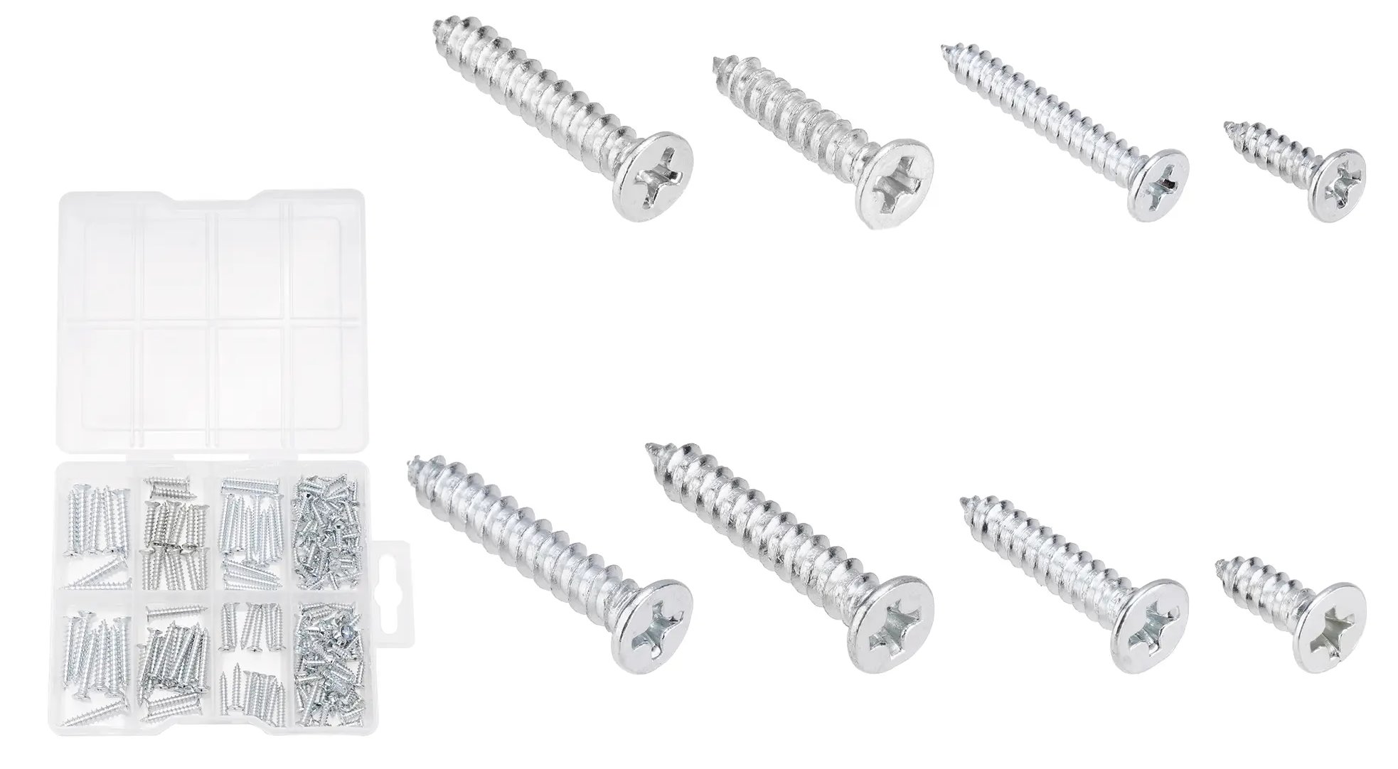 Sada obsahuje 200 ks samořezných šroubů se zápustnou hlavou, ideálních pro pevné a čisté spojení materiálů. Vyrobeny z uhlíkové oceli s pozinkovanou povrchovou úpravou pro zvýšenou odolnost proti korozi. Šrouby mají phillipsový pohon pro snadné a pevné šroubování. Sada zahrnuje různé velikosti pro široké použití v dílně i na stavbě.